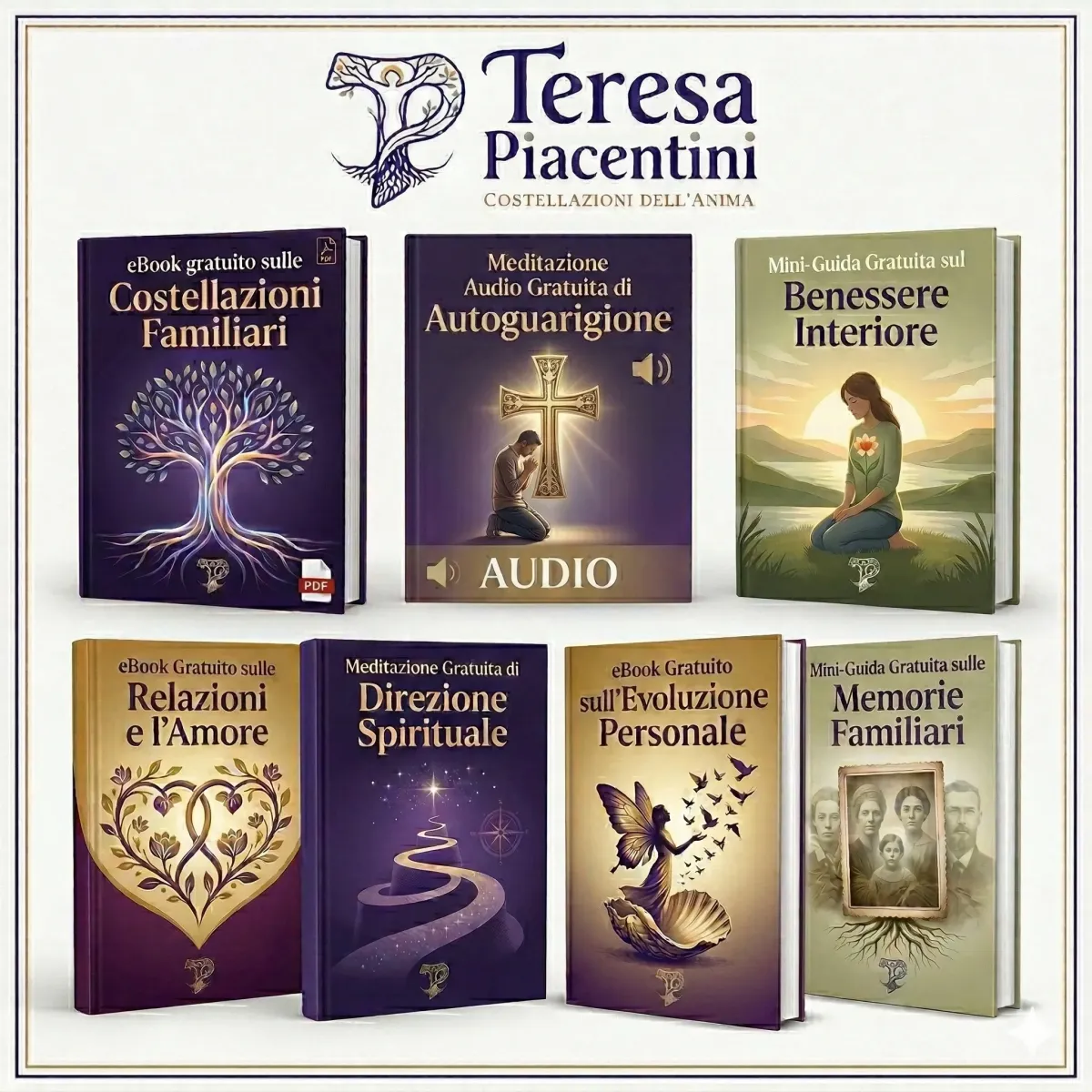 È una guida scritta da Teresa Piacentini per introdurti al metodo delle Costellazioni dell'Anima®. Ti spiega, in modo semplice e profondo, come le memorie familiari influenzano la tua vita — e come iniziare a scioglierle.